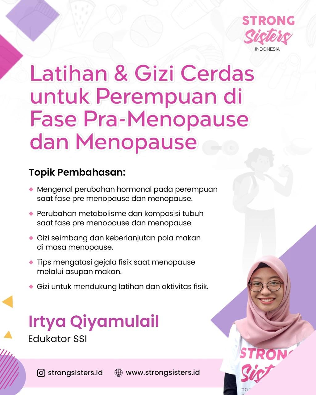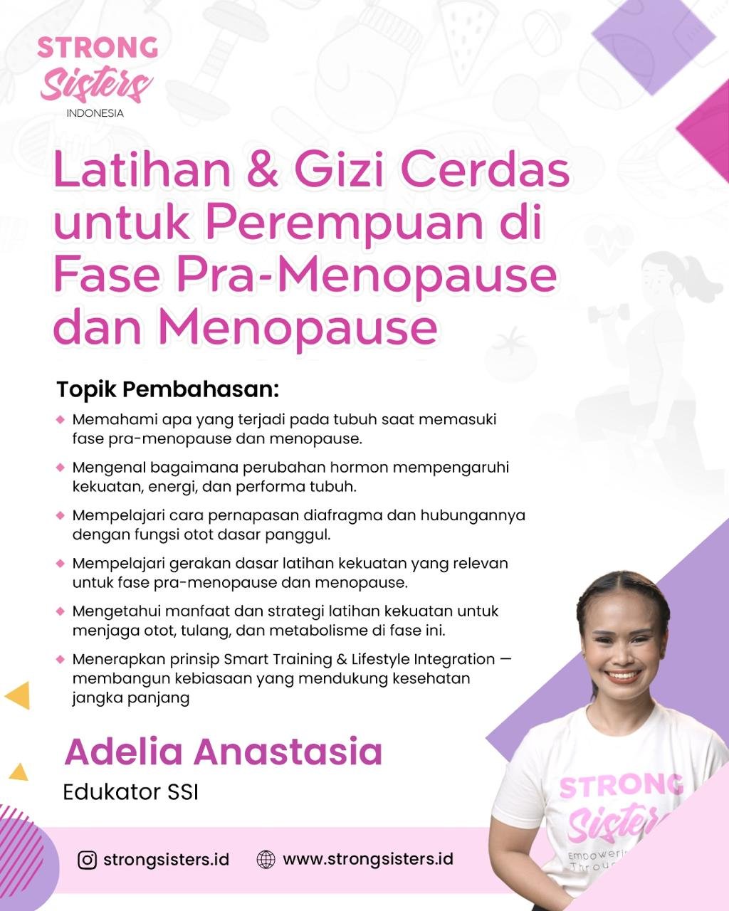 Di workshop ini, kamu akan belajar bagaimana beradaptasi dengan perubahan tubuh secara cerdas β lewat latihan fungsional dan kekuatan bersama Coach Adelia Anastasia, serta penerapan gizi seimbang bersama Irtya Qiyamulail