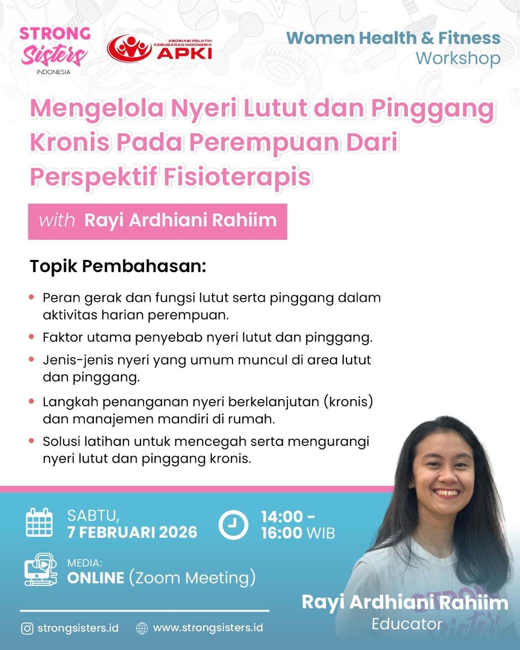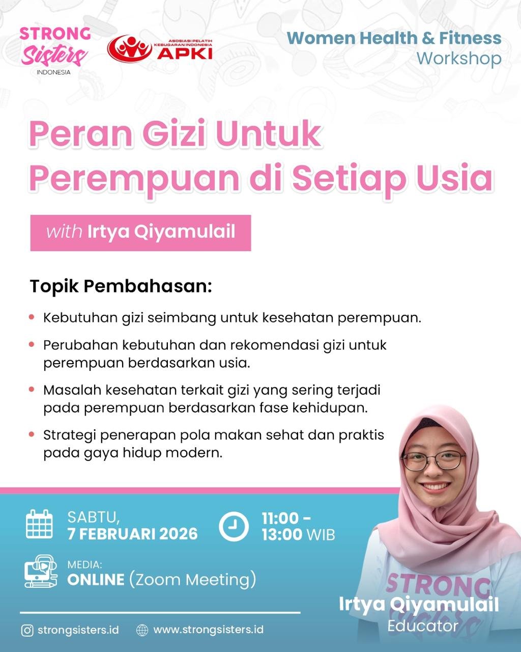 Strong Sisters Indonesia kembali menghadirkan Women Health & Fitness Workshop β sebuah workshop edukasi kesehatan perempuan dengan konsep baru, menghadirkan 3 edukator dan topik yang dikemas lebih variatif, namun tetap membawa tujuan yang sama: